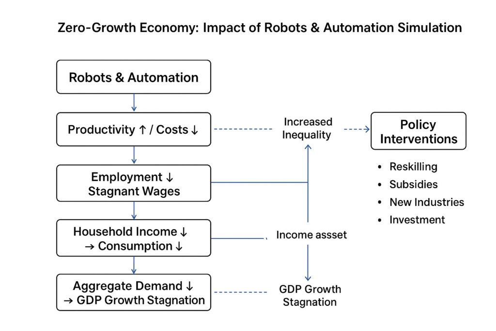 - 특히 제로 경제성장 시대에는 신규 투자와 소비가 제한적이므로, 로봇 도입의 고용 충격이 더 크게 체감됨.